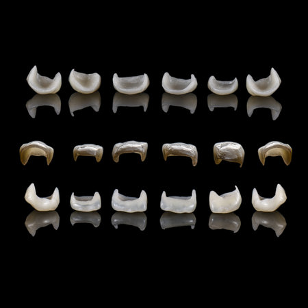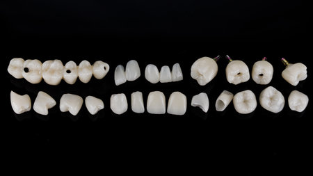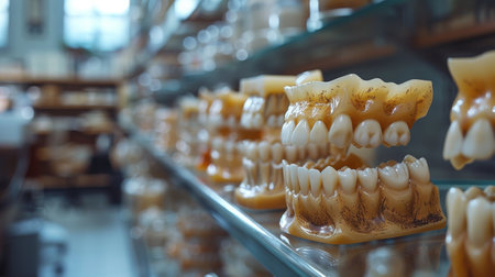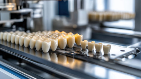 This image showcases advanced dental technology featuring ceramic dental prosthetics on a modern production line, highlighting precision and innovation in dentistry.