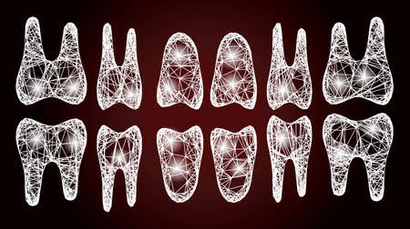 Illuminated crossing mesh teeth jaw with light spots on a dark red gradiented background. Vector frame created from teeth jaw icon, and from crossing lines. Constellation frame hatched mesh teeth jaw.