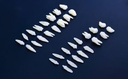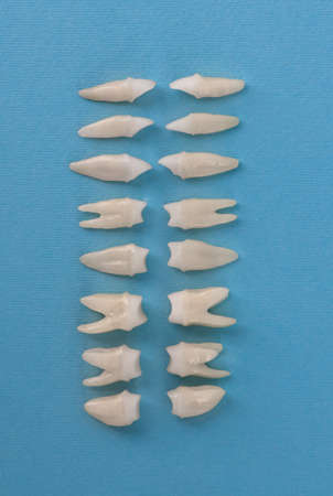 Teeth models standing in a row making a smile on a blue background. dental banner background. Healthy, strong snow-white teeth. World Dentist Day. International Oral Health