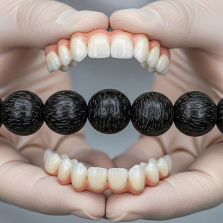 An unusual and artistic photograph captures an open mouth with teeth aligned symmetrically. A strand of dark, textured lava beads is artfully placed between the upper and lower rows of teeth.