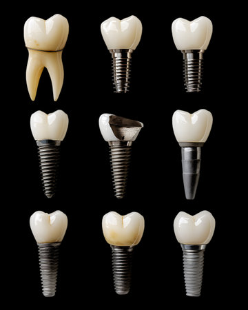 Schematic features a row of dental implants in various colors alongside healthy teeth, set against a clean white background with space for text.