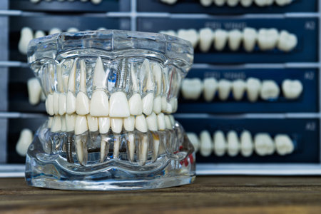 Close-up of a clear anatomical dental model displaying teeth roots, crowns, and implant posts used for educational or clinical purposes.