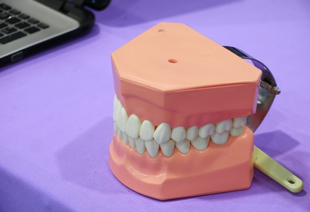 Dentist dental prosthetic teeth, gums, roots close-up. Studying dental diseases concept