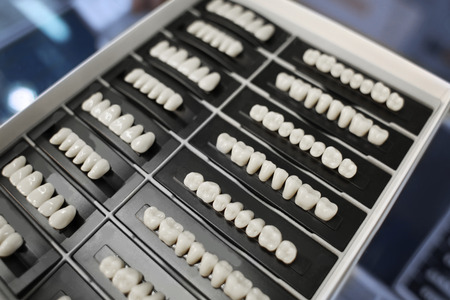 Palette with shades of teeth. Dental samples of tint teeth. Girl chooses perfect teeth color. Close up. High quality photo. Copy space