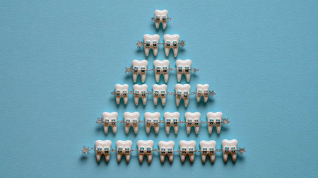 New Year and Christmas card. The tree is made of teeth with braces instead of garland on pastel blue background. Congratulations to the dental clinic for 2026. Dentistry. stomatology