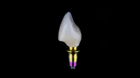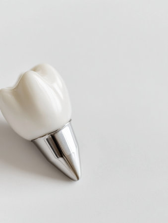 Close view of a detailed dental implant with metal and ceramic materials, positioned on a clean white surface for design purposes.