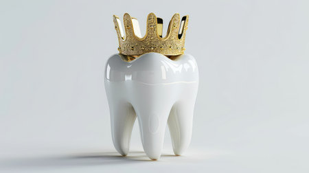 Golden crowned tooth on white porcelain background Dental implant concept for cosmetic dentistry and oral health