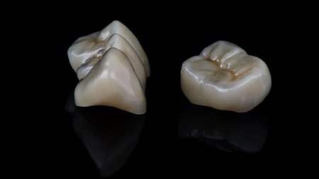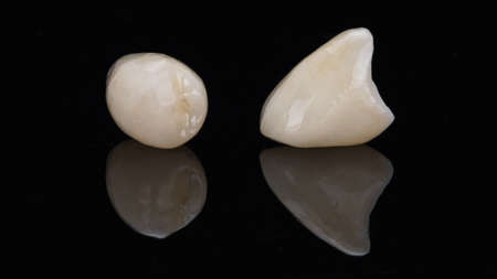 two dental ceramic crowns on black glass with reflection