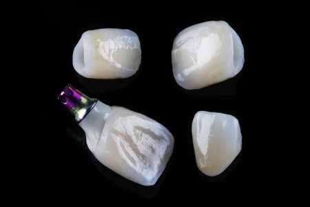 composition of dental crowns made of ceramics to replace the central teeth, shot on a black background
