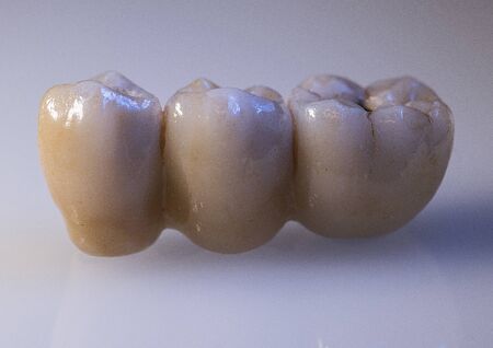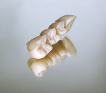 Closeup Prosthetic teeth crown and bridge equipment model express fix restoration.