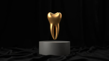 A stunning golden tooth displayed on a pedestal, set against a black velvet background. The luxurious materials highlight the value and beauty of the tooth.