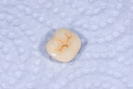 Ceramic-metal crown of human tooth molar. Macro closeup. Dental laboratory, manufacture of tooth rub