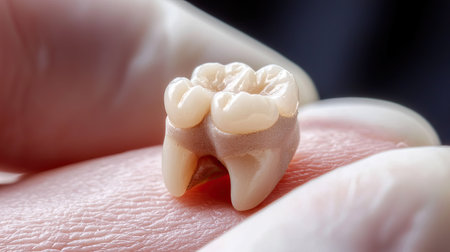 A detailed image of a model human tooth held gently between fingers, showcasing the intricate anatomy and structure for educational and dental purposes.