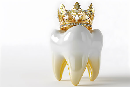 White tooth with gold crown on a white background. 3d rendering
