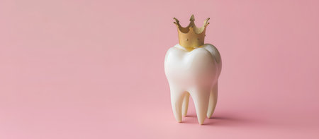 Healthy tooth with golden crown. Isolated on pink background