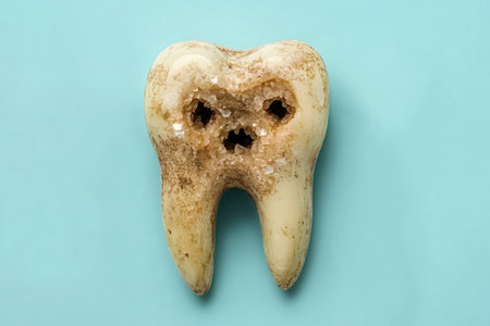 Sugar crystals are covering a decaying tooth on a turquoise background, illustrating the detrimental effects of sugar on dental health and highlighting the importance of oral hygiene