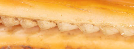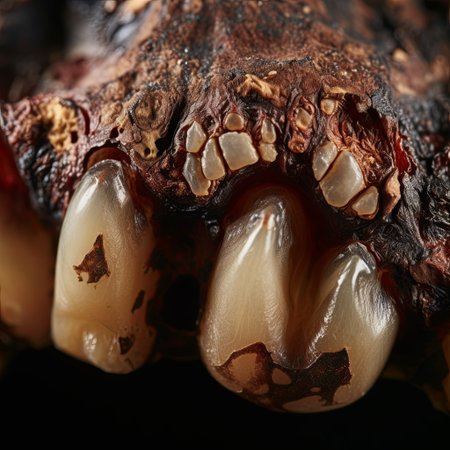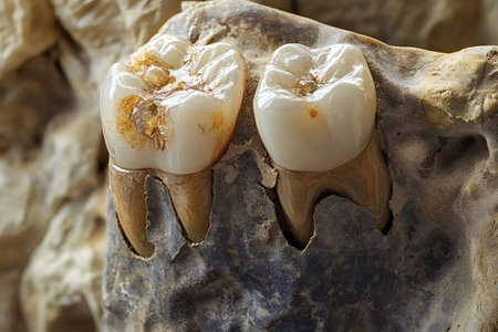 Close-up of fossilized teeth revealing tooth decay embedded within an ancient jawbone, providing insights into dental health in prehistoric times