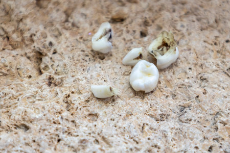 Five extracted baby teeth lie on a stone background. 5 decayed baby teeth affected by caries.