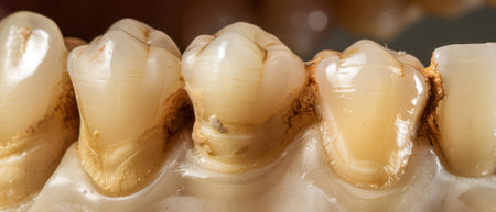 A close-up image of a human mouth, focusing on multiple molars with a significant amount of yellow plaque and tartar buildup visible in the crevices and gum line.