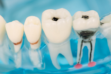 Decayed tooth root canal treatment. Tooth or teeth decay of lower molar. Restoration with a composite filling. Adult caries. bad teeth. Dental temporary restorative material. Dental concept. close up.