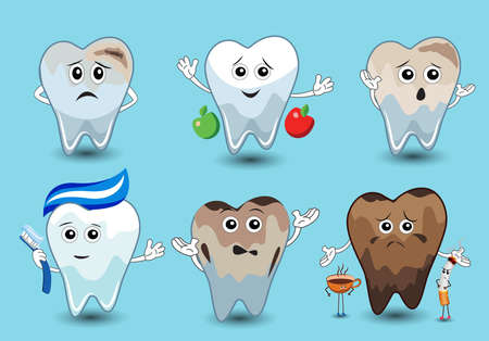 Tooth with and without caries, funny teeth with facial expressions, a healthy and aching tooth requiring treatment, vector illustration for design and creativity