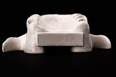 Fitting the long zirconia​ bridge​ in the plaster model for dental Treatment​ on black background.