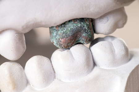Dentist dental prosthetic teeth, gums, roots close-up. Studying dental diseases concept