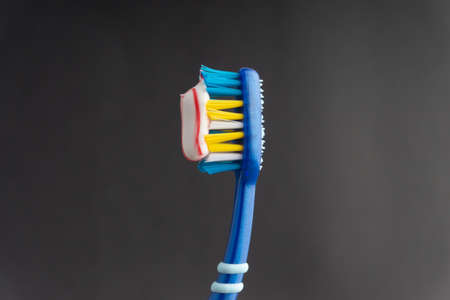 toothbrush with toothpaste on a gray background, close up