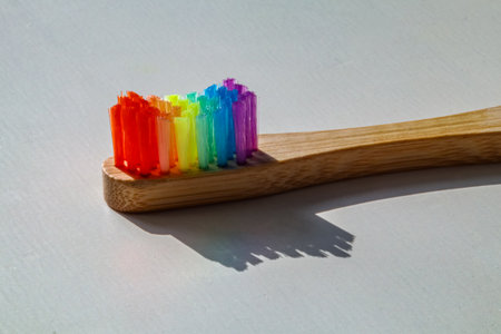 Bamboo toothbrush with rainbow colored bristles on light background. Sustainable oral care, eco friendly hygiene concept with copy space.