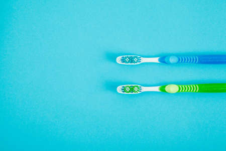 Close-up of red and green toothbrushes on blue background with copy space. Top view