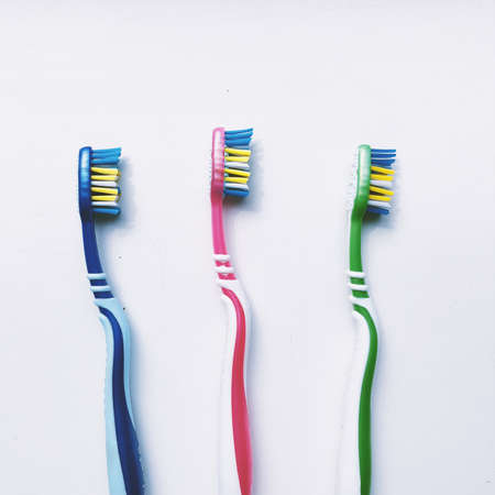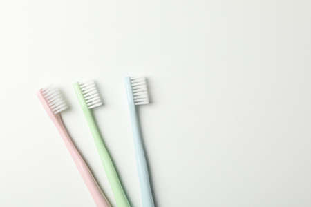 colorful toothbrushes ion white background with copy space