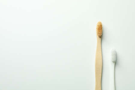 Eco friendly wooden toothbrushes on white background