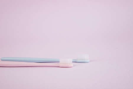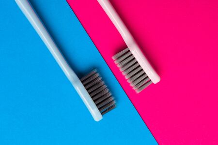 Teeth hygiene and oral dental care products on color pink and blue background with copy space. Toothbrushes Flat lay, top view composition, mockup