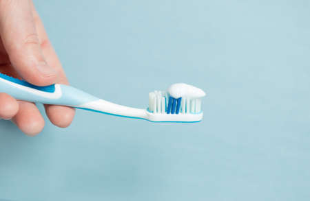 Man holds a toothbrush on a blue background. Copy space. Place for your text. Hygiene of teeth and oral cavity. Mockup. Dental care. Isolated.
