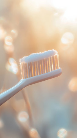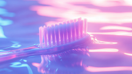 Transparent toothbrush with toothpaste, close-up on bristles against a bright, reflective background for a fresh, minimalist dental feel.