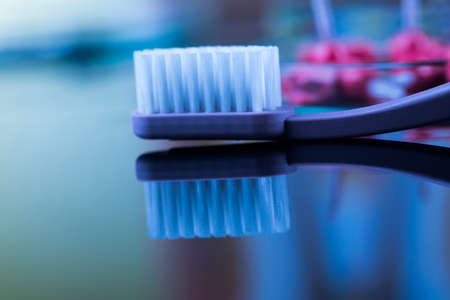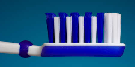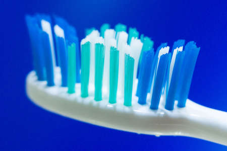 Toothbrush closeup on a blue background. Macro with shallow depth of field.
