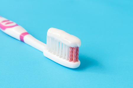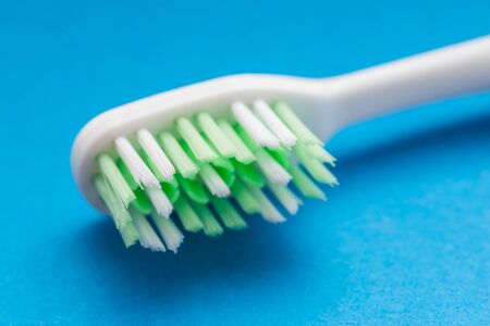 Close up macro plastic white tooth brush on blue background dental hygiene
