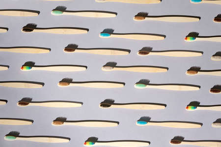 Oral care background. Many toothbrush. Zero waste pattern. Ecological wood brush. Dentist hygiene. Medicine home objects. Recycle dental concept. Repeat. Top view texture. Grey color