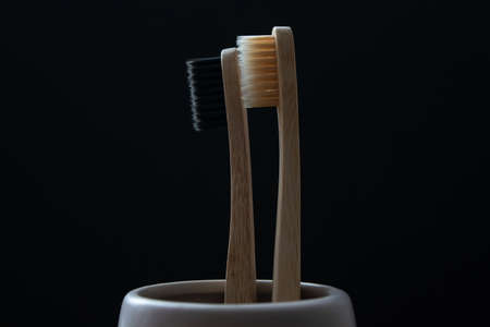 Two bamboo toothbrushes on a black background. The concept of oral and gum care. Recyclable natural organic toothbrush. Place for text.