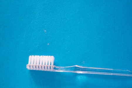 Transparent toothbrush on blue background with copy space