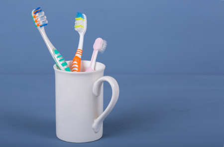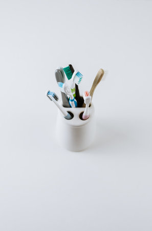 Different types of toothbrushes in a white cup. White background with copy space. oral care concept.