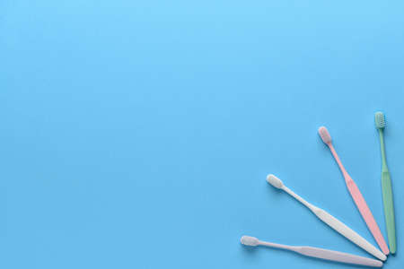 Flat lay composition with manual toothbrushes on color background, close up. creative photo.