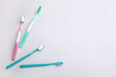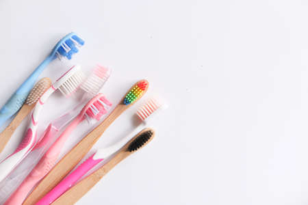 Clean teeth. Colorful plastic toothbrushes on white background top view.