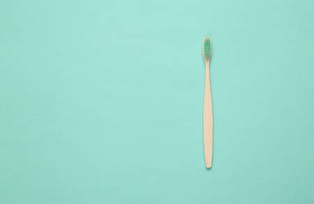 Eco-friendly bamboo toothbrush on blue background. top view. copy space
