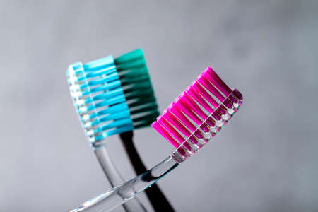Several toothbrushes close-up on a gray background.