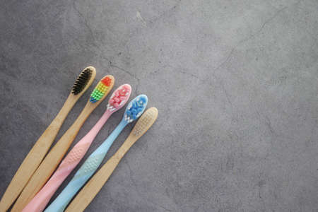 natural bamboo toothbrushes top view. Oral and dental care.
