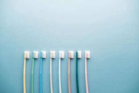 Toothbrushes on light blue background, close up different kinds of Toothbrushes, new not used, isolated