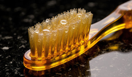 A vibrant yellow toothbrush rests on a shiny black countertop, droplets of water glistening on its bristles. The setting suggests a fresh start to the day with morning routines.