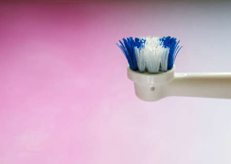 Close-up on the side of the head of a worn out white and blue head of an electric toothbrush against pink gradient