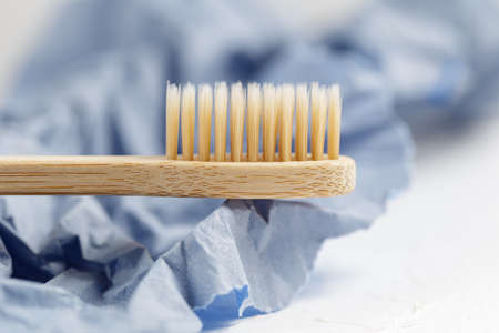 Close up of bamboo toothbrush on a white and purple paper background. Eco friendly products, zero waste concept